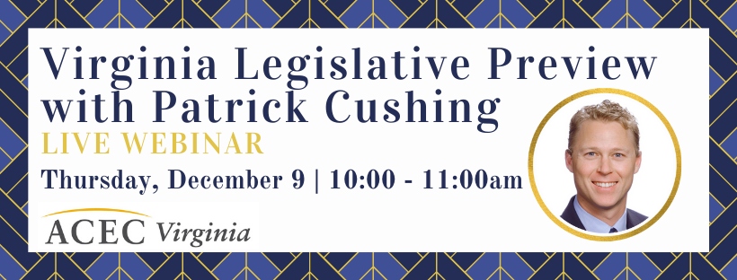 Join us for a 2021 recap and 2022 Session Preview Patrick Cushing of Williams Mullen. Patrick will recap what passed (and what didn’t) during the 2020 Special Session. Patrick will also summarize the Commonwealth’s current fiscal condition and a preview of issues he expects to see during the upcoming Session. Topics will include legislative initiatives that will impact the business community and a focus on those issues that may uniquely impact engineering firms in the Commonwealth.